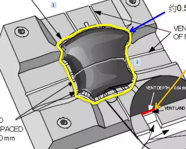 不良現象:如下右圖有注塑燒焦不良,注塑困氣導致; 解決對策:在分模面上加開排氣,位置如下圖