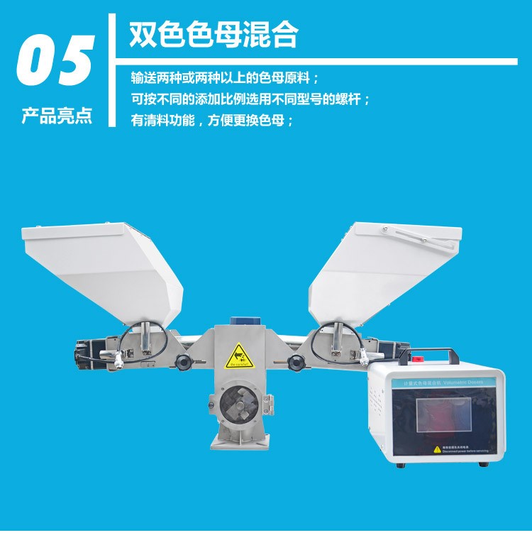 體積式色母機可用于料粒色母原料的計量,生產范圍為0.2~32kg/hr。如果客戶對于色母添加比例及精度要求更高,我們推介使用失重式色母機,采用失重計量方式,生產范圍為0.04~32kg/hr。